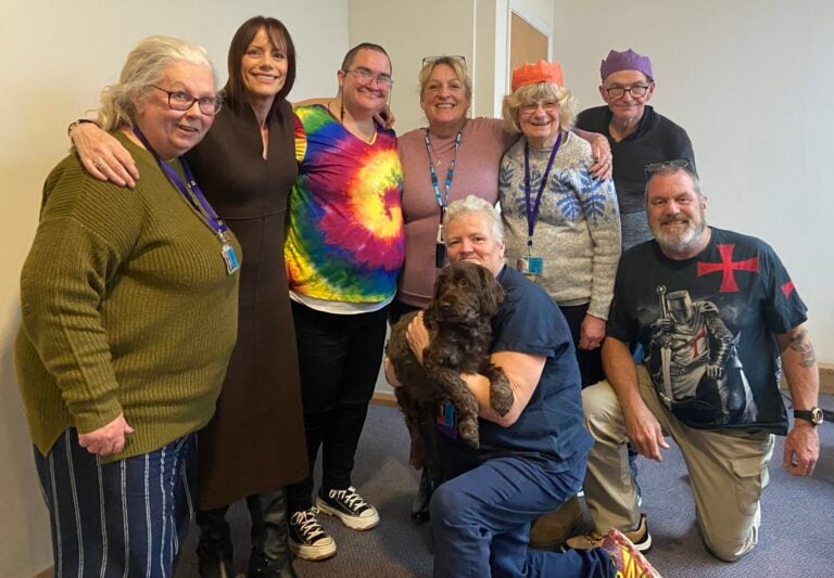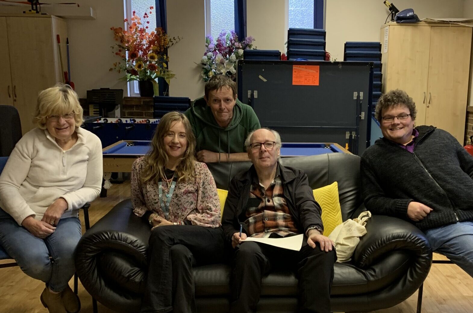 Pictured below – Get together at Oaklands with Mel, Michelle, Tabitha, Mandy, Carol, Roger, Kev, Heidi & Milo (and more peers online)